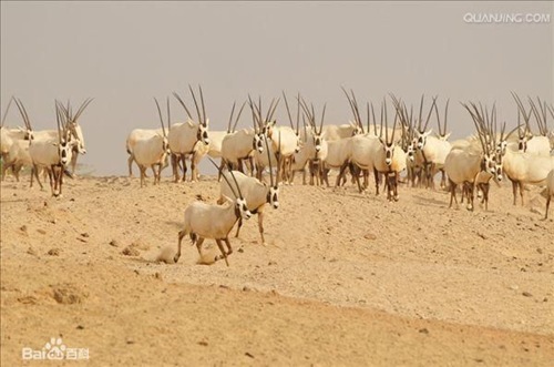 阿拉伯大羚羊:英文名Oryx leucoryx,名列国际濒危物种保护。高0.8-1.4米,体长1.4-1.7米,尾巴为45-90厘米左米,体重比一般的山羊大得多,最重的达210KG,身体毛色为米白色,四肢为褐色,雌雄均有角,角长约0.6~1.5米。