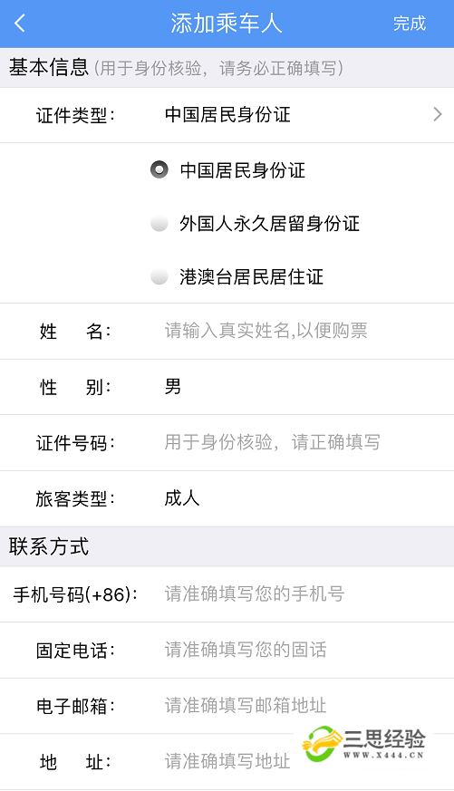 然后按照要求填写联系人姓名、性别、证件号码和联系方式等信息。写好后点击右上角的【完成】。
