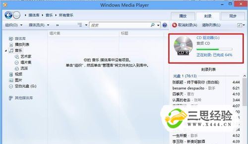 系统自动打开Windows Media Player。单击“开始刻录”按钮 。