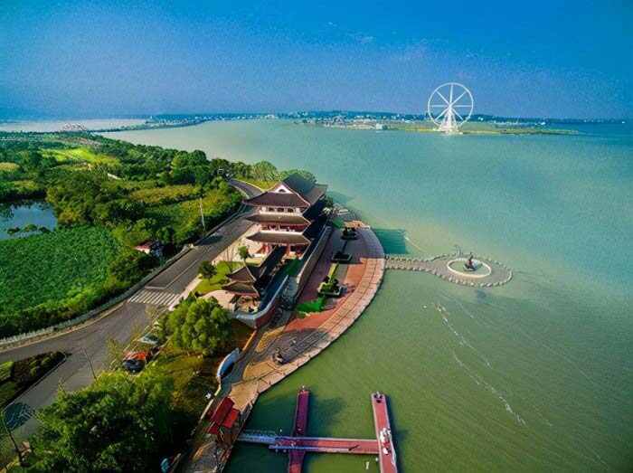 柳叶湖因湖面形似一片柳叶而得名,是五万年前形成的一个天然湖泊,属于西洞庭湖的一部分。坐落在湖南常德古城东北,东临洞庭湖、南临沅江、西依武陵山,北枕太阳山,总面积169平方公里,其中水域面积21.8平方公里,是集山、水、田园、城四位一体的复合型旅游度假区,被誉为“中国城市第一湖”和“城市环抱的水上天堂”。